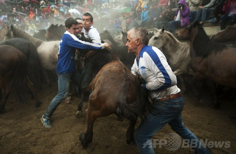 【7月7日 AFP】スペイン北西部サンティアゴデコンポステラ(Santiago de Compostela)から40キロほど離れたサブセド(Sabucedo)村で5日、約400年の歴史を持つ馬の祭り「ラパ・ダス・ベスタス(Rapa Das Bestas、野獣の毛刈りの意)」が行われた。近隣の山林に生息する野生馬数百頭が集められ、囲いに追い込まれると体毛を刈られ、毛づくろいがされた。(c)AFP