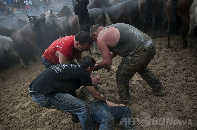 「野獣の毛刈り」祭り、野生の馬を追い込む男性たち スペイン