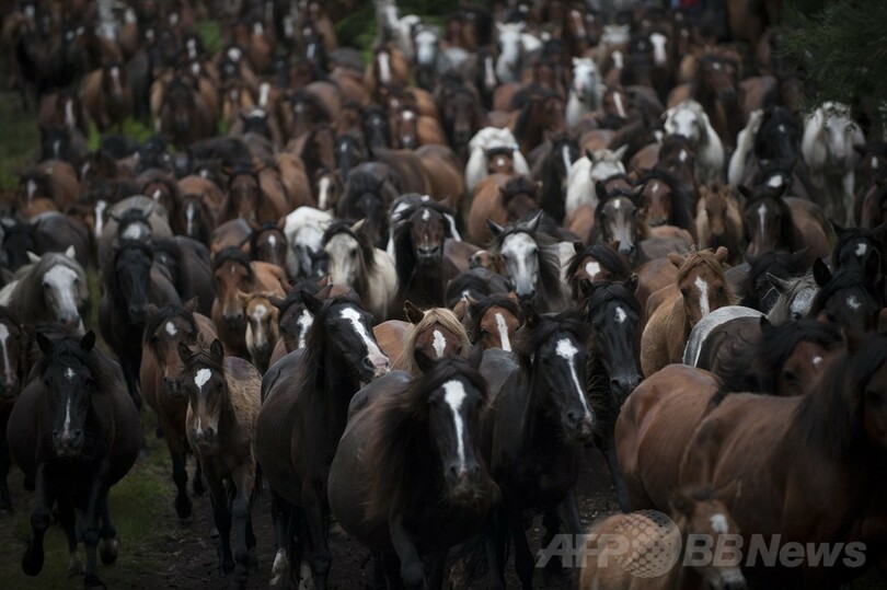 【7月7日 AFP】スペイン北西部サンティアゴデコンポステラ(Santiago de Compostela)から40キロほど離れたサブセド(Sabucedo)村で5日、約400年の歴史を持つ馬の祭り「ラパ・ダス・ベスタス(Rapa Das Bestas、野獣の毛刈りの意)」が行われた。近隣の山林に生息する野生馬数百頭が集められ、囲いに追い込まれると体毛を刈られ、毛づくろいがされた。(c)AFP