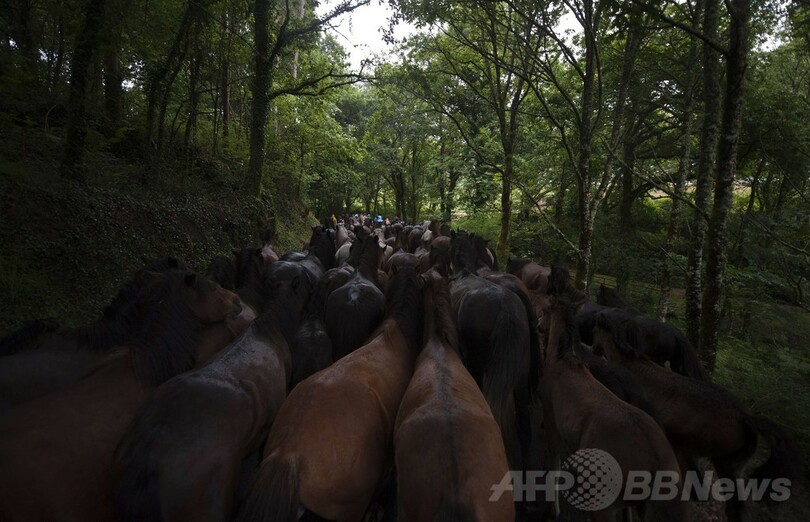 【7月7日 AFP】スペイン北西部サンティアゴデコンポステラ(Santiago de Compostela)から40キロほど離れたサブセド(Sabucedo)村で5日、約400年の歴史を持つ馬の祭り「ラパ・ダス・ベスタス(Rapa Das Bestas、野獣の毛刈りの意)」が行われた。近隣の山林に生息する野生馬数百頭が集められ、囲いに追い込まれると体毛を刈られ、毛づくろいがされた。(c)AFP