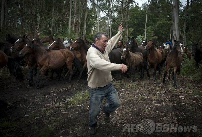 「野獣の毛刈り」祭り、野生の馬を追い込む男性たち スペイン