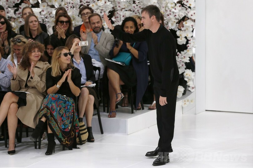 今年に入りシモンズは、女性に特定のスタイルを無理強いさせたくないと語っている。目指すのは、彼の服を着ていてもハイヒールを脱ぎ捨てて踊りに行けるようなスタイルだという。「(オートクチュールは)劇場に行くように、女性たちが観賞するものになってしまいました。もっと生活スタイルに結び付けたものにしたいと思っています」(c)AFP/Helen ROWE