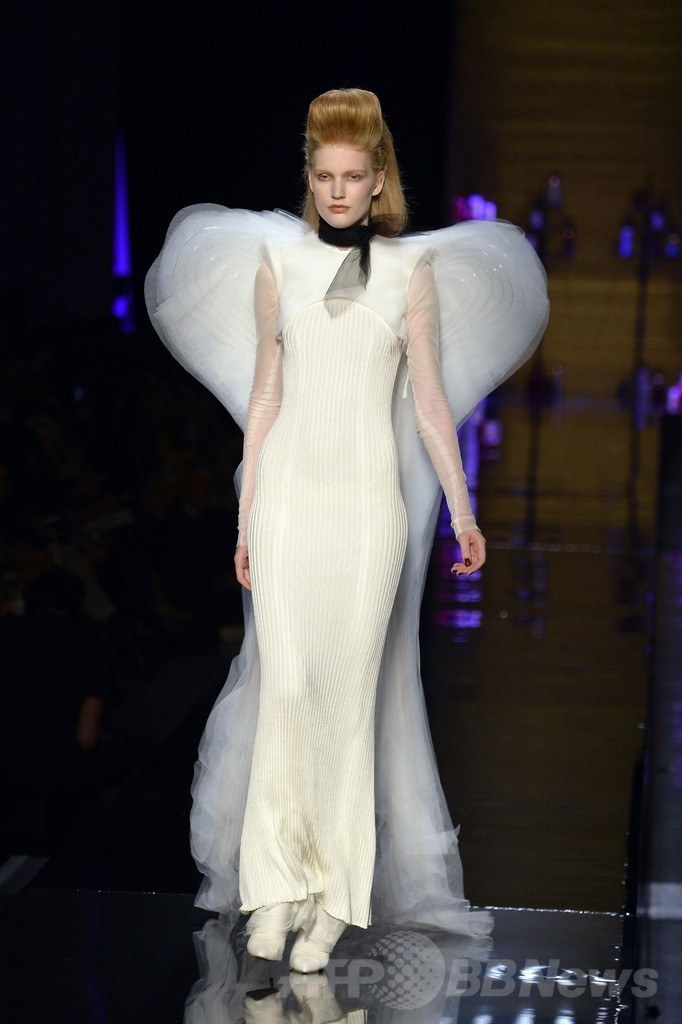 9日には、 「ジャンポール・ゴルチエ(Jean-Paul Gaultier)」が新作を発表。ランウェイには欧州国別対抗歌謡祭「ユーロビジョン・ソング・コンテスト(Eurovision Song Contest)」優勝者でひげを生やしたドラァグクイーン(女装パフォーマー)として一躍話題となったコンチータ・ウルスト(Conchita Wurst)さんも登場した。(c)AFP