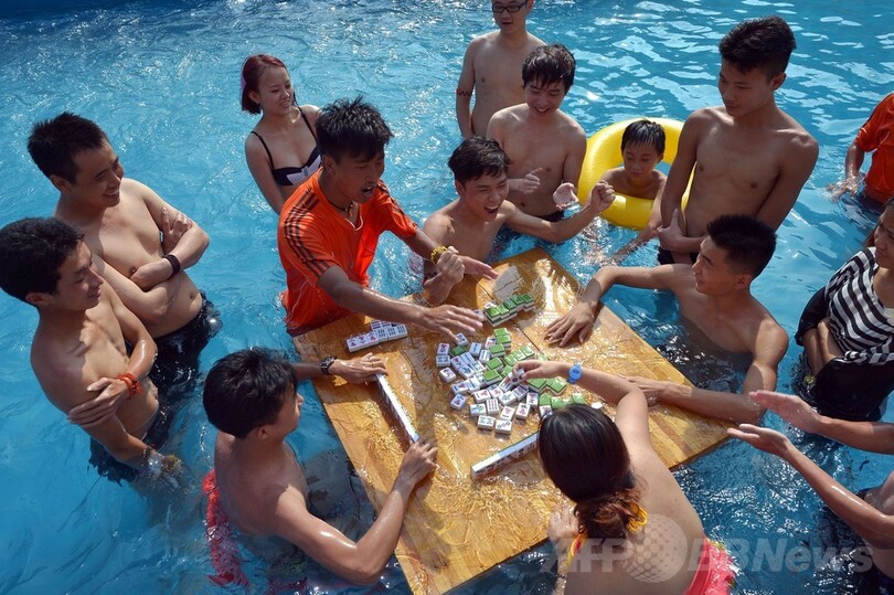 【7月11日 AFP】中国南西部・重慶(Chongqing)で9日、暑さをしのぐためにプールを訪れた人々が水面に浮かぶテーブルでマージャンを楽しむ姿が見られた。同市の気象当局によると、市内の一部地域ではこの日、40度を超える暑さとなった。(c)AFP