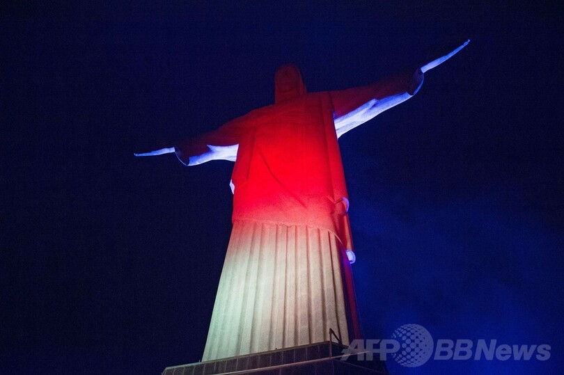 【7月13日 AFP】サッカーW杯ブラジル大会(2014 World Cup)の決勝を翌日に控えた12日、リオデジャネイロ(Rio de Janeiro)にあるコルコバード(Corcovado)の丘の巨大なキリスト像(Christ the Redeemer)が、決勝戦に出場するアルゼンチンとドイツの国旗の色にライトアップされた。(c)AFP