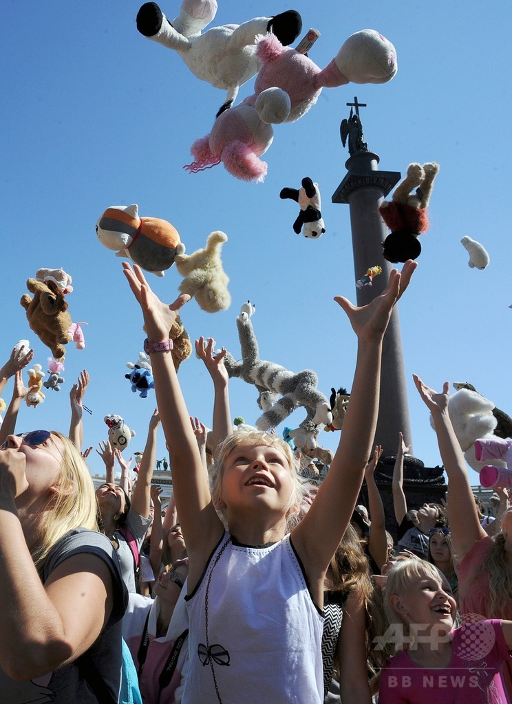 【7月18日 AFP】ロシアのサンクトペテルブルク(St. Petersburg)で16日、インターネットの呼びかけに応じて特定の場所に多数の人が集結して突発的パフォーマンスなどを繰り広げる「フラッシュモブ」が行われた。今回のテーマは「ぬいぐるみパレード」で、ぬいぐるみを持った多数の人々が宮殿広場に集まった。(c)AFP