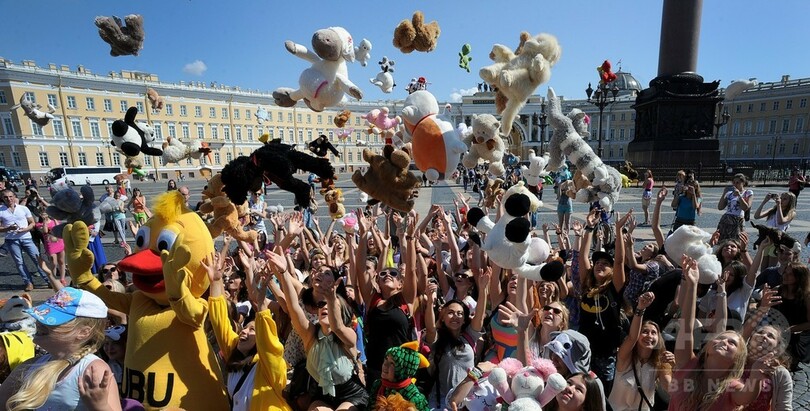 【7月18日 AFP】ロシアのサンクトペテルブルク(St. Petersburg)で16日、インターネットの呼びかけに応じて特定の場所に多数の人が集結して突発的パフォーマンスなどを繰り広げる「フラッシュモブ」が行われた。今回のテーマは「ぬいぐるみパレード」で、ぬいぐるみを持った多数の人々が宮殿広場に集まった。(c)AFP