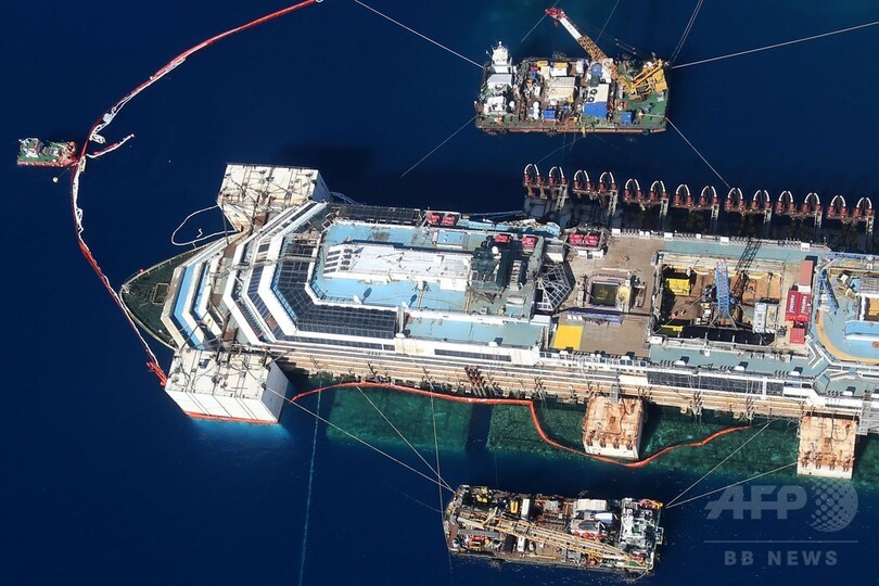座礁して横倒しになっていたコンコルディア号は、2013年9月に引き起こされた。直近の作業では、船体を浮上させ、えい航できるようにするための巨大なタンクが接合された。