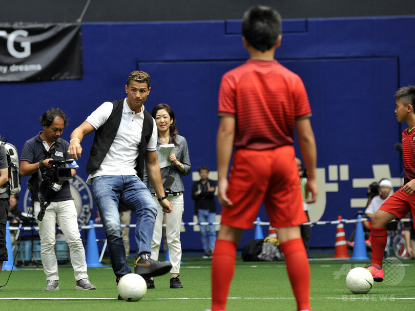 【7月24日 AFP】サッカーポルトガル代表のクリスティアーノ・ロナウド(Cristiano Ronaldo)が23日、スキンケア製品や美容機器を販売する株式会社MTGの本社を訪問後、サッカー教室に参加して子どもたちと交流した。(c)AFP