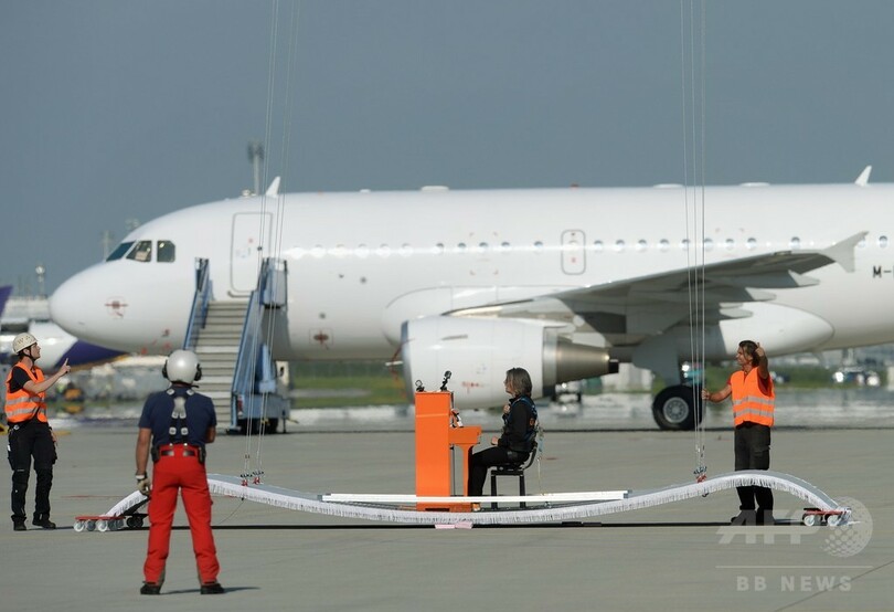 【7月24日 AFP】ドイツ南部ミュンヘン(Munich)の国際空港で23日、ピアニストのシュテファン・アーロン(Stefan Aaron)さんが、ヘリコプターでつり上げられた「空飛ぶじゅうたん」風のアルミニウム製構造物に乗り演奏を披露した。
