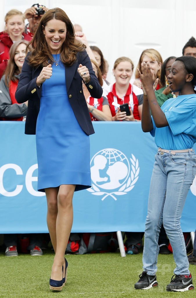 この日キャサリン妃は、「スマイス(Smythe)」のネイビージャケットに、「ステラ マッカートニー(Stella McCartney)」の鮮やかなブルーのワンピース、「スチュアート ワイツマン(Stuart Weitzman)」のコルクヒールのウェッジシューズを着用して、南アフリカ伝統のゲームに参加した。(c)MODE PRESS