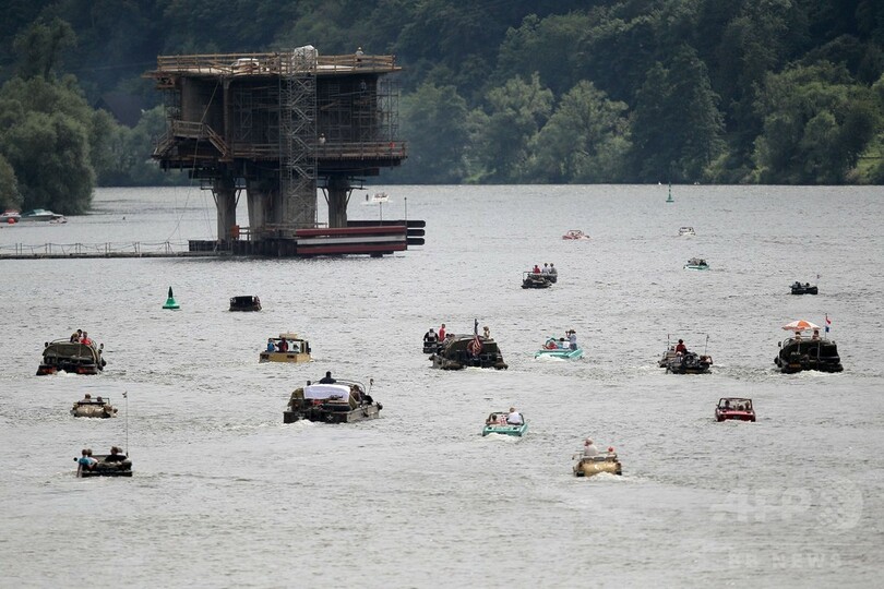 【8月4日 AFP】ドイツのトラーベン・トラバッハ(Traben-Trabach)近郊のモーゼル(Mosel)川で2~8日まで、今年4回目を迎える水陸両用車の祭典「アンフィビ(Amphib)2014」が開催されている。(c)AFP