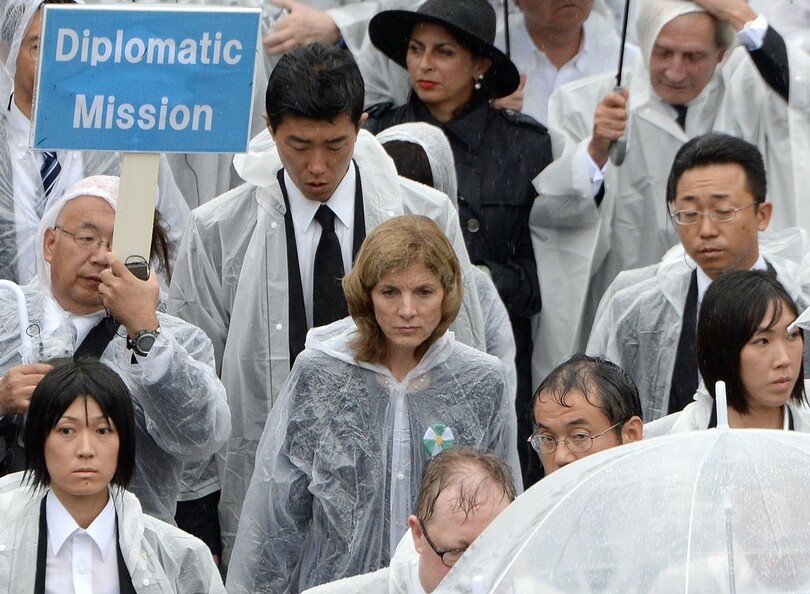 雨の中参列した被爆者やその親族、安倍晋三(Shinzo Abe)首相ら政府関係者に加え、キャロライン・ケネディ(Caroline Kennedy)駐日米大使などの外国政府関係者は、原爆投下時刻の午前8時15分に黙とうをささげた。