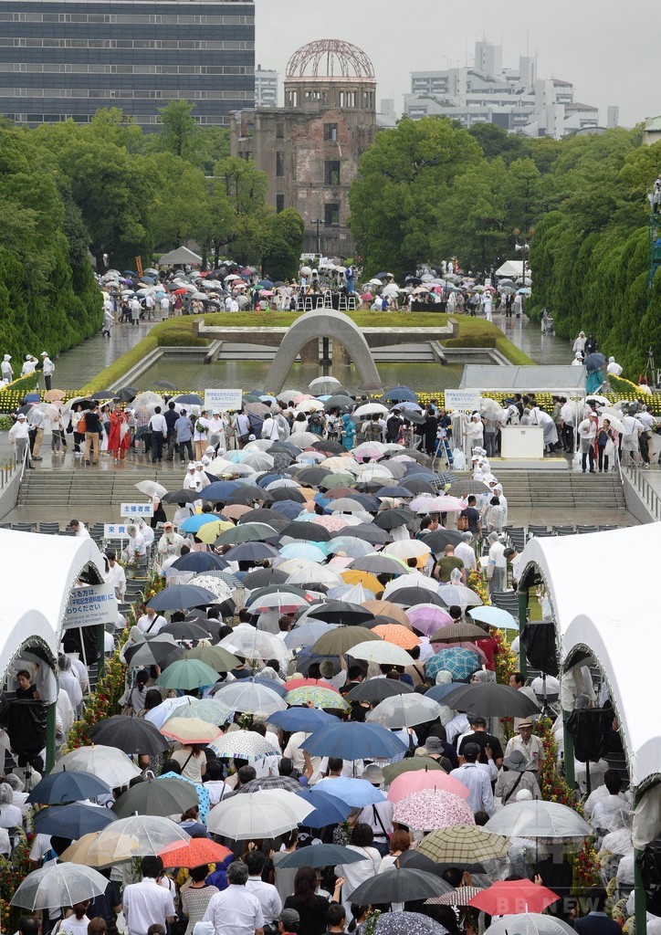 雨の中参列した被爆者やその親族、安倍晋三(Shinzo Abe)首相ら政府関係者に加え、キャロライン・ケネディ(Caroline Kennedy)駐日米大使などの外国政府関係者は、原爆投下時刻の午前8時15分に黙とうをささげた。