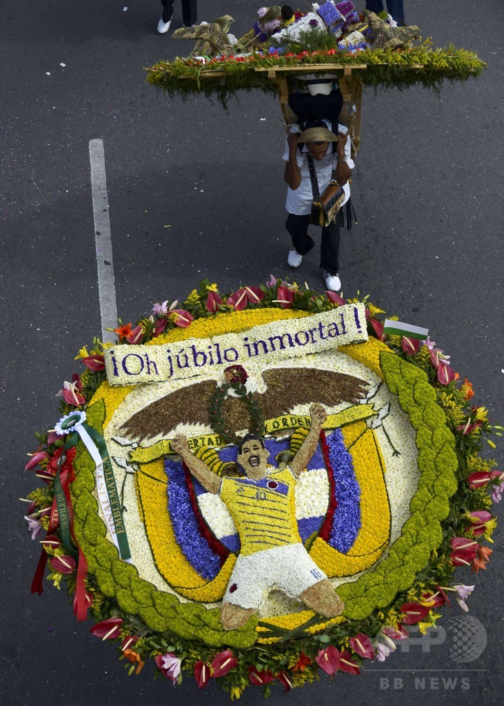 【8月12日 AFP】南米コロンビアのアンティオキア(Antioquia)州メデジン(Medellin)で毎年恒例のイベント「花の祭典(Flower Festival)」が開催されている。その一環として行われたシジェテロスのパレード(Silleteros parade)では、今年のW杯ブラジル大会(2014 World Cup)で活躍した同国代表ハメス・ロドリゲス(James Rodriguez)選手をかたどった花のデコレーションもみられた。(c)AFP