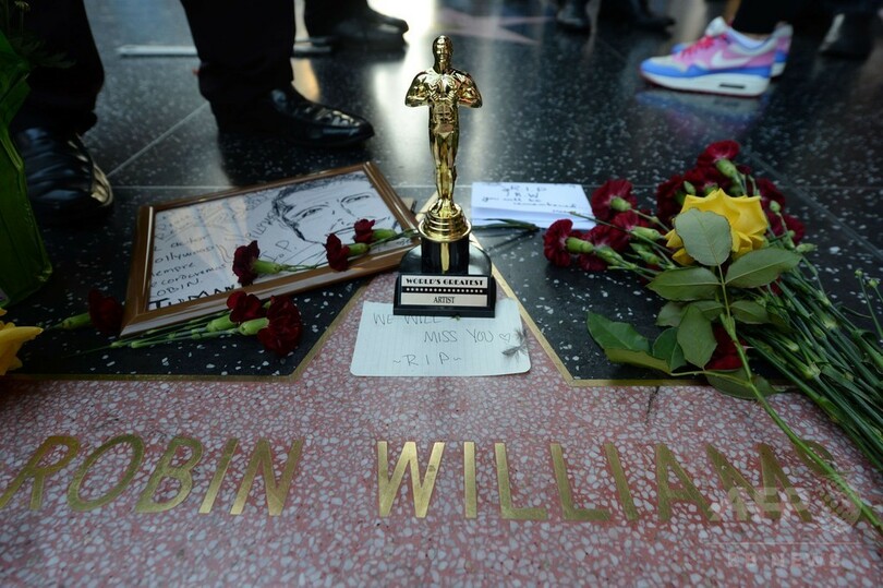 【8月12日 AFP】米ロサンゼルス(Los Angeles)ハリウッド(Hollywood)で11日、同日死去した米オスカー俳優でコメディアンのロビン・ウィリアムズ(Robin Williams)さん(63)の死を悼み、大勢のファンが花や思い出の品をハリウッド・ウォーク・オブ・フェーム(Hollywood Walk of Fame)のプレートに手向ける姿が見られた。(c)AFP