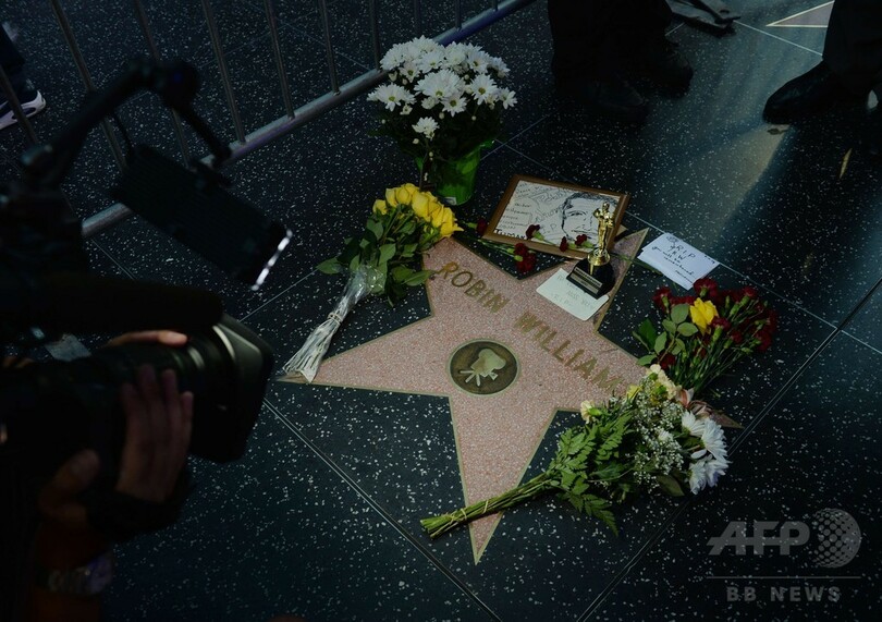 【8月12日 AFP】米ロサンゼルス(Los Angeles)ハリウッド(Hollywood)で11日、同日死去した米オスカー俳優でコメディアンのロビン・ウィリアムズ(Robin Williams)さん(63)の死を悼み、大勢のファンが花や思い出の品をハリウッド・ウォーク・オブ・フェーム(Hollywood Walk of Fame)のプレートに手向ける姿が見られた。(c)AFP