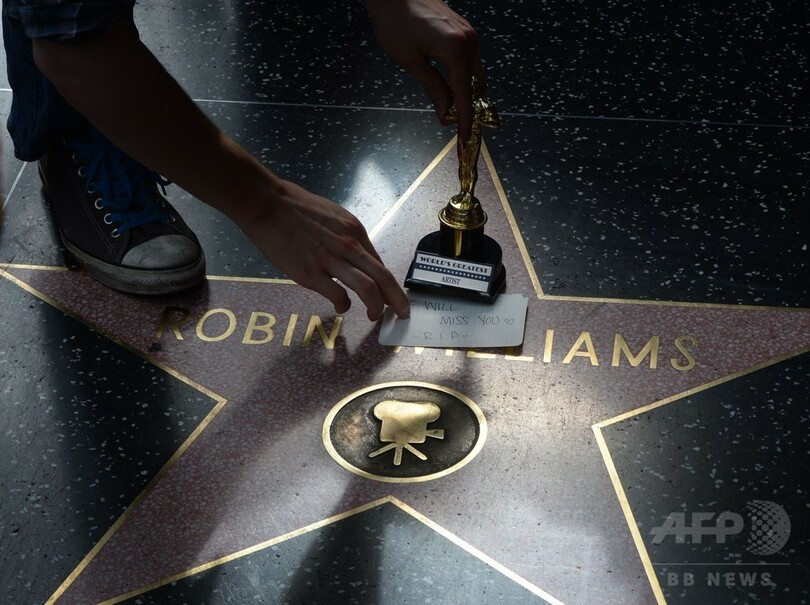 【8月12日 AFP】米ロサンゼルス(Los Angeles)ハリウッド(Hollywood)で11日、同日死去した米オスカー俳優でコメディアンのロビン・ウィリアムズ(Robin Williams)さん(63)の死を悼み、大勢のファンが花や思い出の品をハリウッド・ウォーク・オブ・フェーム(Hollywood Walk of Fame)のプレートに手向ける姿が見られた。(c)AFP