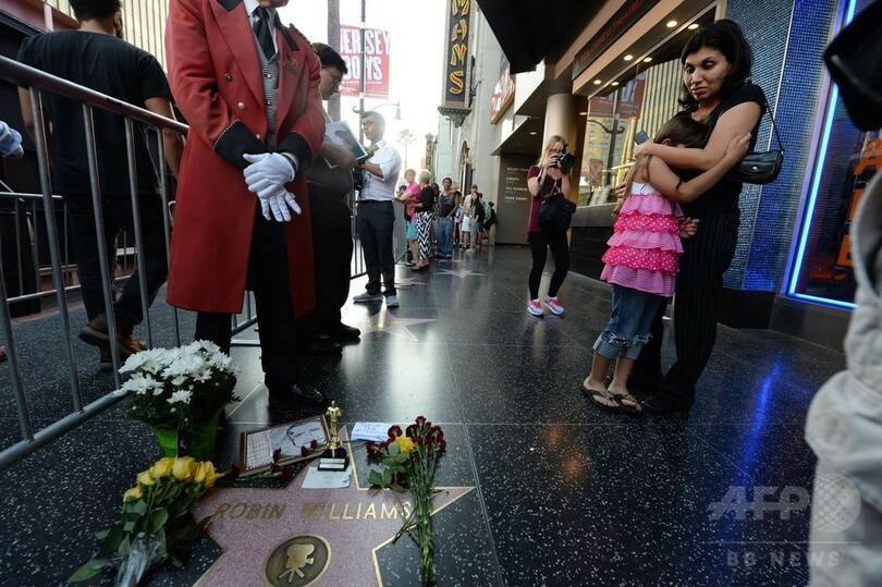【8月12日 AFP】米ロサンゼルス(Los Angeles)ハリウッド(Hollywood)で11日、同日死去した米オスカー俳優でコメディアンのロビン・ウィリアムズ(Robin Williams)さん(63)の死を悼み、大勢のファンが花や思い出の品をハリウッド・ウォーク・オブ・フェーム(Hollywood Walk of Fame)のプレートに手向ける姿が見られた。(c)AFP