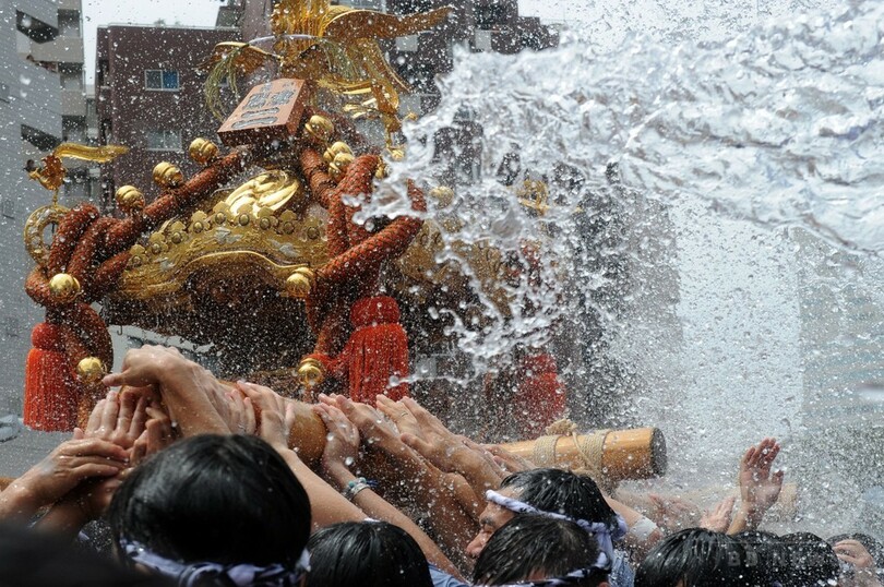 【8月17日 AFP】江戸三大祭の一つ、深川八幡祭り(Fukagawa Hachiman Festival)の連合渡御(とぎょ)が17日、東京都江東区の富岡八幡宮周辺で行われた。沿道の観客からみこし行列の担ぎ手たちに清めの水がかけれられる中、50基以上のみこしが一帯を練り歩いた。(c)AFP