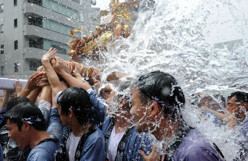 【8月17日 AFP】江戸三大祭の一つ、深川八幡祭り(Fukagawa Hachiman Festival)の連合渡御(とぎょ)が17日、東京都江東区の富岡八幡宮周辺で行われた。沿道の観客からみこし行列の担ぎ手たちに清めの水がかけれられる中、50基以上のみこしが一帯を練り歩いた。(c)AFP
