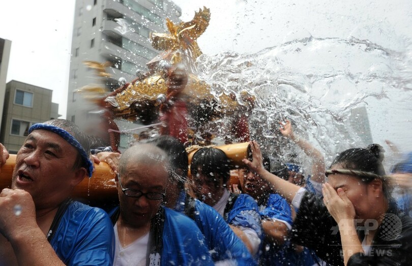 【8月17日 AFP】江戸三大祭の一つ、深川八幡祭り(Fukagawa Hachiman Festival)の連合渡御(とぎょ)が17日、東京都江東区の富岡八幡宮周辺で行われた。沿道の観客からみこし行列の担ぎ手たちに清めの水がかけれられる中、50基以上のみこしが一帯を練り歩いた。(c)AFP