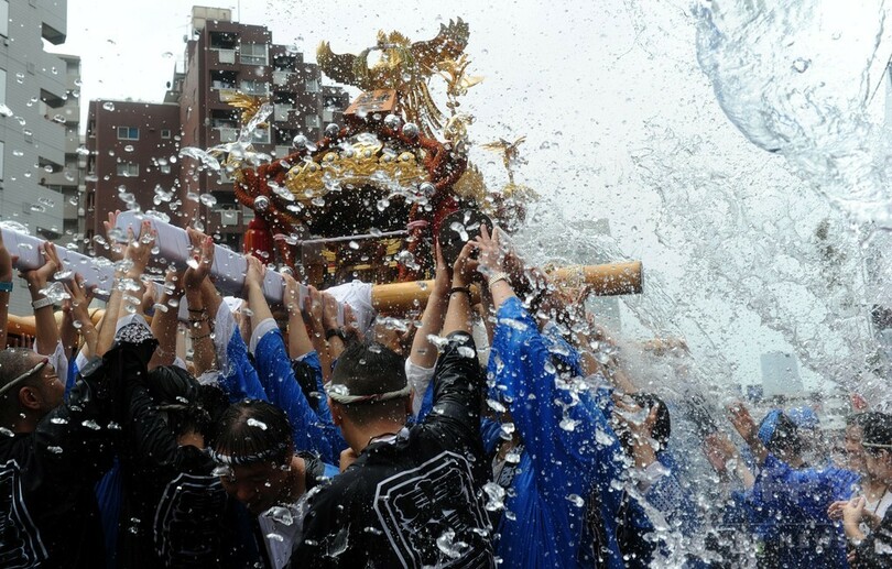 【8月17日 AFP】江戸三大祭の一つ、深川八幡祭り(Fukagawa Hachiman Festival)の連合渡御(とぎょ)が17日、東京都江東区の富岡八幡宮周辺で行われた。沿道の観客からみこし行列の担ぎ手たちに清めの水がかけれられる中、50基以上のみこしが一帯を練り歩いた。(c)AFP