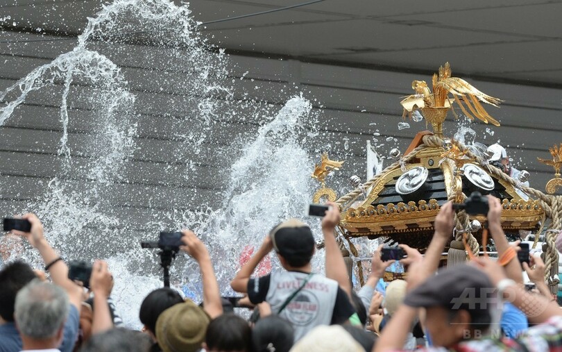 【8月17日 AFP】江戸三大祭の一つ、深川八幡祭り(Fukagawa Hachiman Festival)の連合渡御(とぎょ)が17日、東京都江東区の富岡八幡宮周辺で行われた。沿道の観客からみこし行列の担ぎ手たちに清めの水がかけれられる中、50基以上のみこしが一帯を練り歩いた。(c)AFP