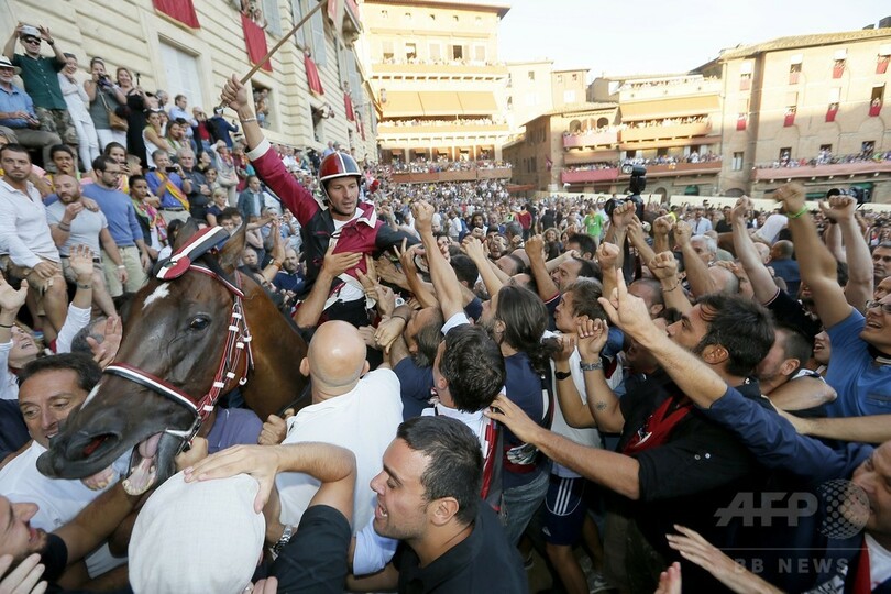 ニュース ライフ 中世から伝わる競馬「パリオ」開催、イタリア 2014年8月18日 11:27 発信地:シエナ/イタリア [ ヨーロッパ イタリア ] このニュースをシェア ‹ › ❮ 6/12 ❯ イタリア・シエナ(Siena)で開催された伝統的な競馬「パリオ(Palio)」で優勝した騎手(2014年8月16日撮影)。(c)AFP/FABIO MUZZI 画像作成中 ! 【8月18日 AFP】イタリア・シエナ(Siena)で週末、その起源を中世にさかのぼる伝統的な競馬「パリオ(Palio)」が開催された。各地区代表の騎手10人が裸馬にまたがり、市中心部の広場に設置された簡易コースで競い合った。パリオは毎年2回、聖母マリアにまつわる祝日に開催される。(c)AFP ライフ 一覧へ> メディア・報道関係・法人の方向け 写真・動画 購入のお問合せ>