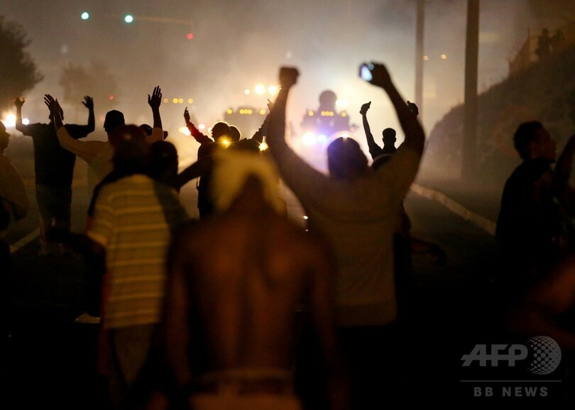 抗議デモや暴動で緊迫した状況が続くファーガソンでは17日夜、夜間外出禁止令が有効となる午前0時の3時間前に機動隊が一部暴徒化したデモ隊に向けて催涙ガスを発射。地元テレビによると、人々は火炎瓶で応酬し、群衆の中で銃声も聞こえたという。(c)AFP