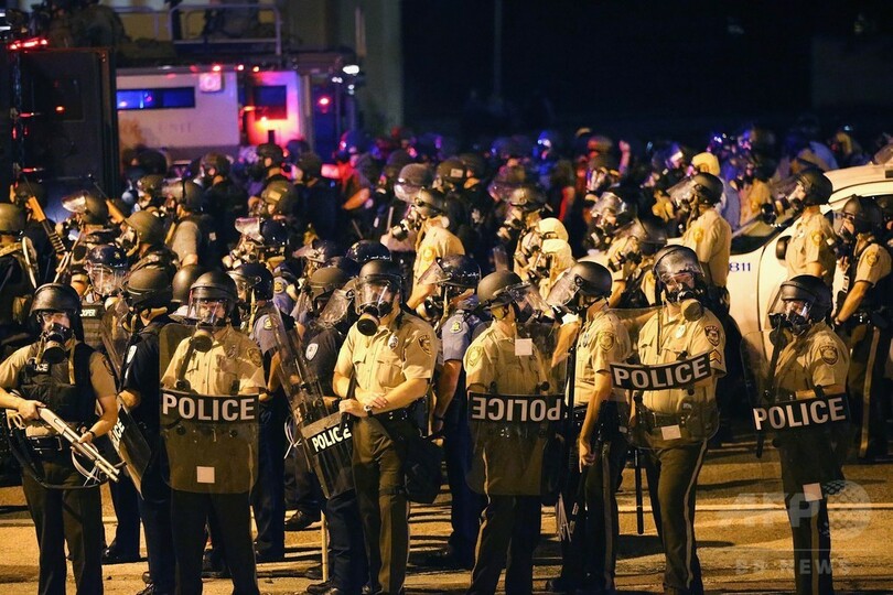 ファーガソンは、今月9日に丸腰の黒人青年マイケル・ブラウン(Michael Brown)さん(18)が白人の警官に射殺されて以来、激しい抗議デモや暴動で緊迫している。17日夜には暴徒に対し、警察が催涙弾とゴム弾を使用。暴徒が火炎瓶で応酬するなど衝突は激化している。(c)AFP