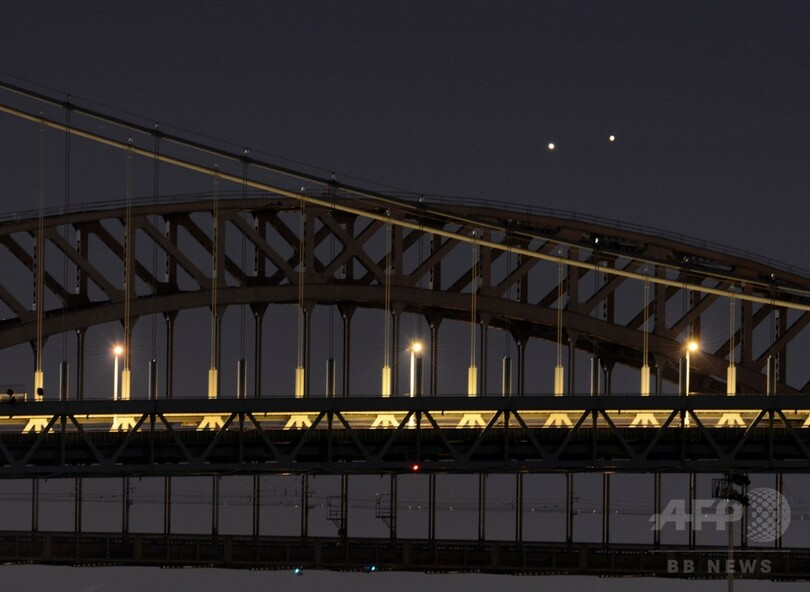 ニュース ライフ 金星と木星、ニューヨークの夜空に並んで浮かぶ 2014年8月19日 16:14 発信地:ニューヨーク/米国 [ 北米 米国 ] このニュースをシェア ‹ › ❮ 5/6 ❯ 米ニューヨーク(New York)のヘルゲート橋(Hell Gate Bridge、奥)およびロバート・F・ケネディ橋(Robert F. Kennedy Bridge、手前)越しに観測された金星(左)と木星(2014年8月18日撮影)。(c)AFP/Stan HONDA 画像作成中 ! 【8月19日 AFP】米ニューヨーク(New York)で18日未明、夜空に並ぶ金星と木星が観測された。2つの惑星は地球から観測した際の離角が0.25度まで接近。今後は徐々に離れていく。(c)AFP ライフ 一覧へ> メディア・報道関係・法人の方向け 写真・動画 購入のお問合せ>