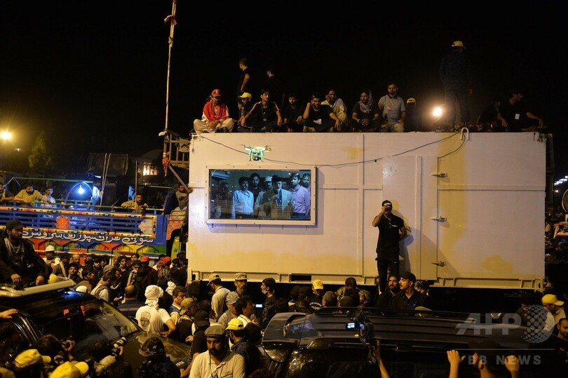 両氏は、首相の退陣を求め、同国東部ラホール(Lahore)から支持者らを率いて2日間の「長いデモ行進」を実施。首都に到着した後も、5日間にわたりデモ集会を続けている。19日夜には、1週間に及ぶ政治的混乱を受け、国内で強大な力を持つ軍も介入し、政府側との協議を呼び掛けた。(c)AFP/Sajjad TARAKZAI