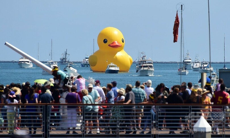 ラバー・ダックは、同港で20日から24日まで開催される帆船の祭典「トールシップ・フェスティバル(Tall Ships Festival)」の開幕に合わせ、大型帆船の列を率いて入港。埠頭には大勢が見物に集まった。(c)AFP