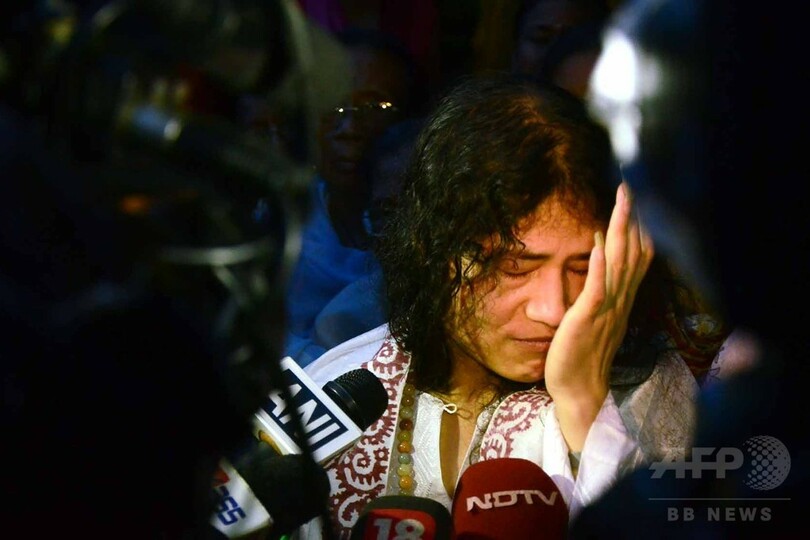 断固とした非暴力の抗議で「マニプールの鉄の女(Iron Lady of Manipur)」として知られるシャルミラさんは涙を見せ、釈放されて「うれしい」と語った。だが、軍による人権侵害に対する抗議として始めた断食は、今後も続ける考えだという。(c)AFP/Trudy HARRIS