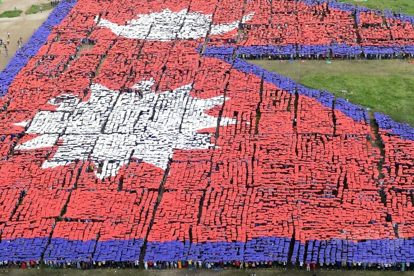 【8月24日 AFP】ネパールの首都カトマンズ(Kathmandu)で23日、3万5000人以上が同市中心部にある広場に集まり、世界最大の「人間国旗」作りに挑戦した。