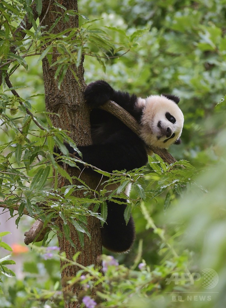 バオバオは、長寿を象徴する桃や多産を象徴するざくろが描かれたポスターをつかんだり、木に登ったりして、動くぬいぐるみのような愛くるしい姿を見せていた。(c)AFP