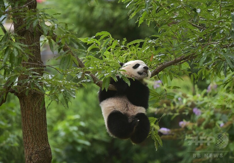 バオバオは、長寿を象徴する桃や多産を象徴するざくろが描かれたポスターをつかんだり、木に登ったりして、動くぬいぐるみのような愛くるしい姿を見せていた。(c)AFP