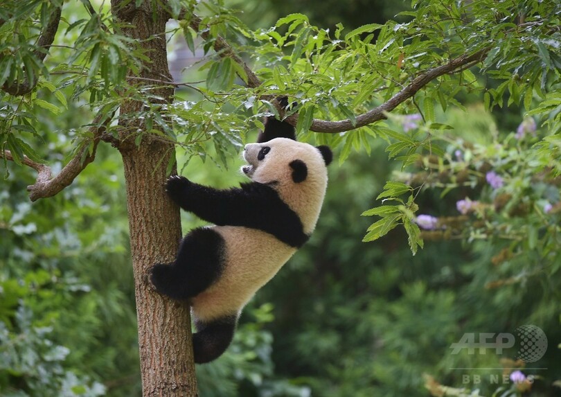 バオバオは、長寿を象徴する桃や多産を象徴するざくろが描かれたポスターをつかんだり、木に登ったりして、動くぬいぐるみのような愛くるしい姿を見せていた。(c)AFP