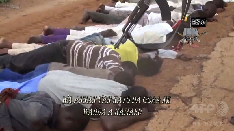 さらに動画の後半になると、民間人とみられる男性約20人が後ろ手に縛られた状態で道端にうつぶせに寝かされ、至近距離から銃で撃たれる映像や、女装して町を脱出しようとしたとされる男性2人がシャベルで撲殺される映像、既に多数の遺体で埋まった塹壕らしき溝の脇で2人が銃殺される映像など、処刑とみられる残忍な場面が続いている。(c)AFP/Aminu ABUBAKAR