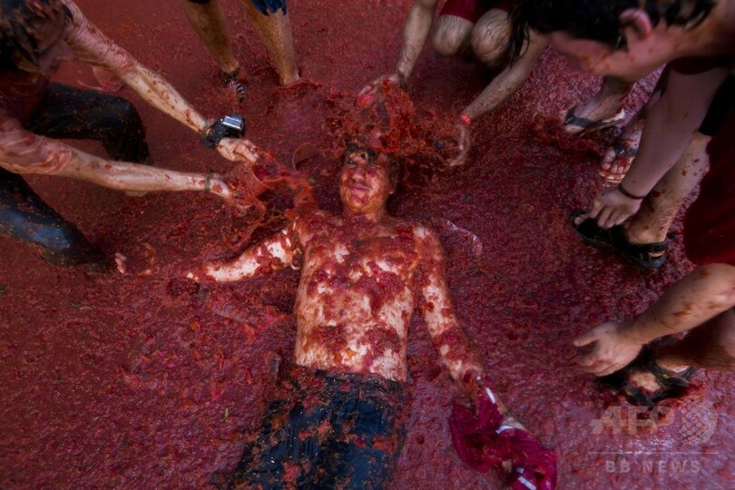 【8月28日 AFP】スペイン東部ブニョール(Bunol)で27日、「世界最大のフードファイト」として知られる毎年恒例の「トマティーナ(Tomatina)」が開催され、果肉まみれで真っ赤に染まった参加者たちがトマトを投げ合った。