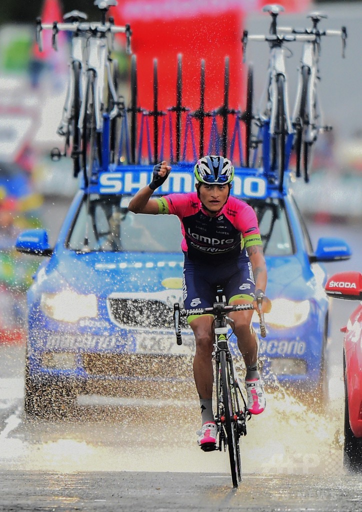 一方、アナコナの後方では、優勝候補が総合首位の座を巡る駆け引きを始め、キンタナとカチューシャ・チームのホアキン・ロドリゲス(Joaquim Rodriguez、スペイン)が同大会2度の総合優勝を誇るコンタドールのアタックに反応したが、フルームとバルベルデは置き去りにされた。(c)AFP