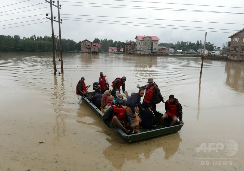スリナガルでは7日、ジェラム(Jhelum)川のはん濫により市内の広範が冠水、住民らは屋根の上に避難した。小児病院を含む2件の病院で浸水被害が出たとの情報も伝えられている。