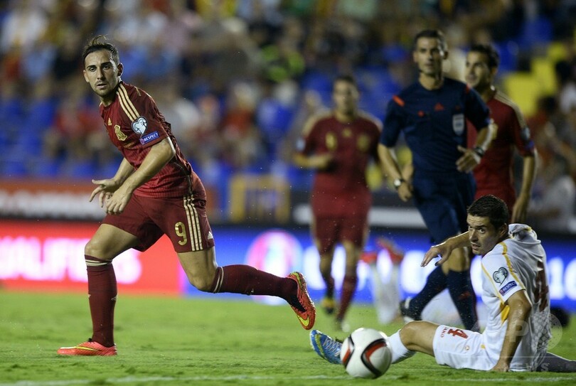 セルヒオ・ラモス(Sergio Ramos)のPKで先制したスペインは、スペイン1部リーグのバレンシア(Valencia CF)に所属するアルカセルのゴールでリードを広げたものの、マケドニアはアギム・イブライミ(Agim Ibraimi)のPKで1点を返した。
