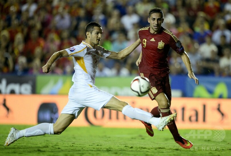 セルヒオ・ラモス(Sergio Ramos)のPKで先制したスペインは、スペイン1部リーグのバレンシア(Valencia CF)に所属するアルカセルのゴールでリードを広げたものの、マケドニアはアギム・イブライミ(Agim Ibraimi)のPKで1点を返した。