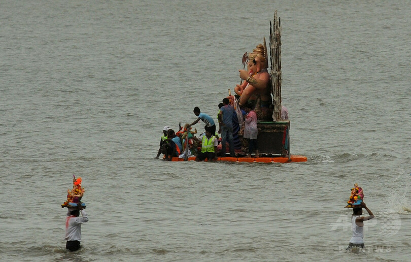 【9月9日 AFP】インド各地で、10日間にわたるヒンズー教の祭り「ガネーシャ祭(Ganesha Festival)」が開催された。祭りでは、健康と幸運、知恵をもたらす神のガネーシャの像を海へと運び、水に浸してお祀りする。(c)AFP