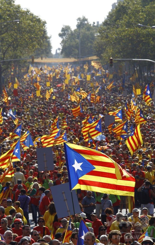 9月11日はスペインによる1714年のカタルーニャ征服の日。今年は州政府が11月9日に独立の是非を問う住民投票の実施を宣言している上に、英国のスコットランド(Scotland)が独立の是非を問う住民投票を来週実施することもあり、かつてない盛り上がりをみせた。独立派が率いるバルセロナ市幹部は報道陣に対し、デモの参加者は推計180万人だったと語った。一方、スペイン中央政府はそれよりもかなり少ない47万~52万人程度だったとしている。(c)AFP