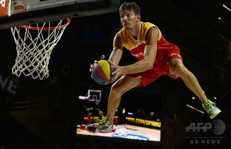 【9月13日 AFP】スペインで開催されているFIBAバスケットボール・ワールドカップ(FIBA Basketball World Cup 2014)の準決勝、セルビア対フランスの試合前に、パフォーマーがアクロバティックなプレーを披露した。(c)AFP
