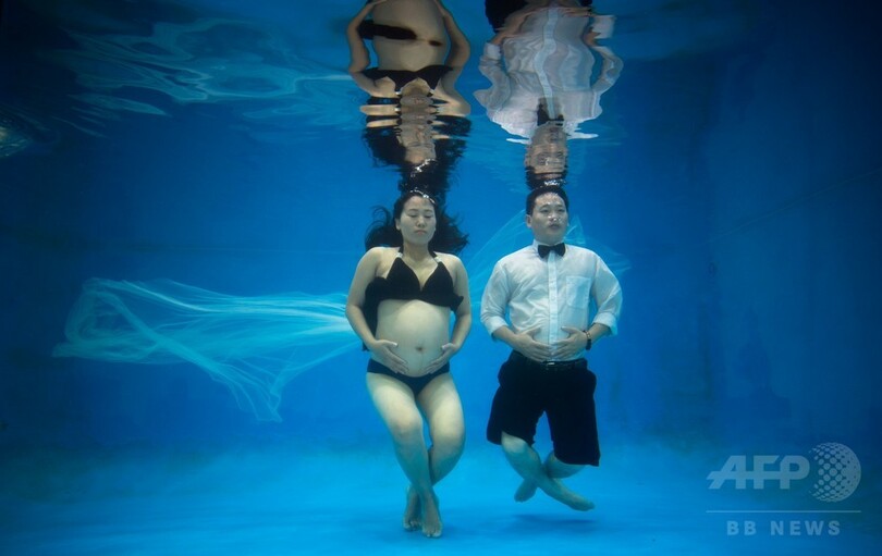 【9月15日 AFP】中国・上海(Shanghai)の写真スタジオで、水中での写真撮影に臨む夫婦。夫婦は第一子の出産を間近に控え、水中での記念撮影を決めたという。このスタジオでは、約4年前から水中撮影のサービスを提供している。(c)AFP