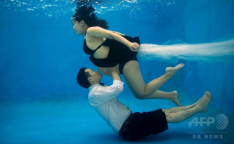 【9月15日 AFP】中国・上海(Shanghai)の写真スタジオで、水中での写真撮影に臨む夫婦。夫婦は第一子の出産を間近に控え、水中での記念撮影を決めたという。このスタジオでは、約4年前から水中撮影のサービスを提供している。(c)AFP